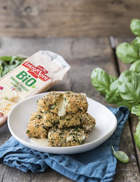 Haal elke rechthoek emmentaler Entremont door het geklopte ei en nadien door het kruidenpaneermeel.