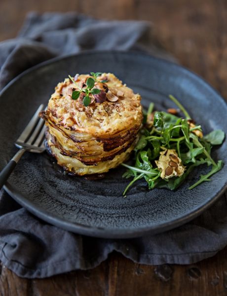 Leg roestvrijstalen bakringen op een met bakpapier beklede bakplaat en vet ze in. Leg de aardappelschijfjes in de ringen, bestrijk ze telkens royaal met gesmolten boter en kruid elke laag met peper en zout. Leg er halverwege een paar plakjes peer op en vul aan met de resterende aardappelen.