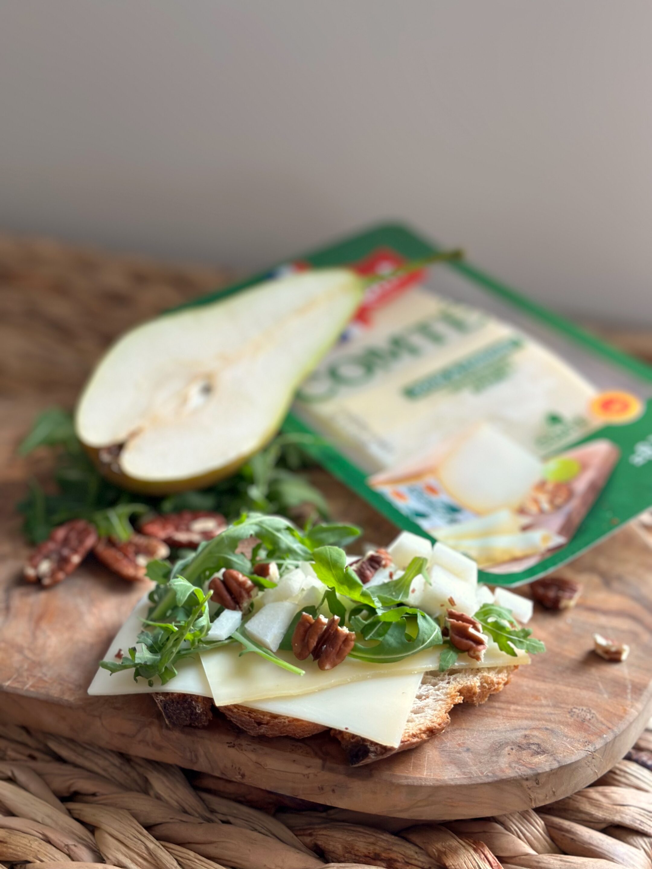 Beleg de toast met de sneetjes kaas, enkele stukjes peer en de rucola. Werk af met wat gehakte pecannoten, een scheutje olijfolie, een snuifje zout en wat peper.