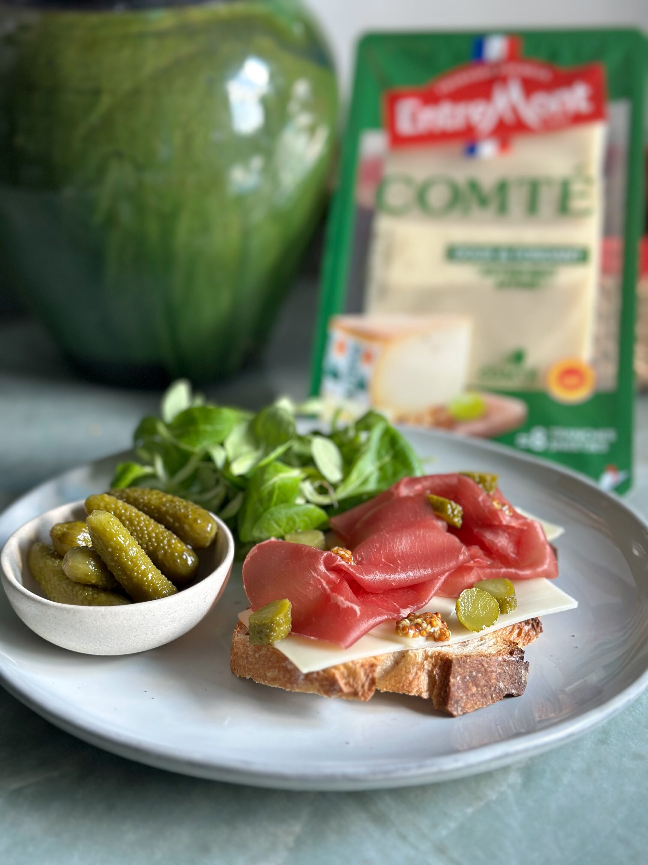 Beleg de toast met de sneetjes kaas, de bresaola en de augurkenschijfjes. Werk af met wat grove mosterd en veldsla.