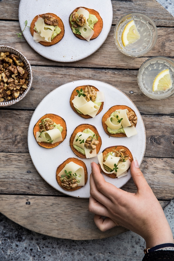 Leg een eetlepel avocadopuree op de zoete aardappeltoast, en strooi daarover schilfertjes zachte emmentaler van Entremont, enkele verse noten en een beetje verse tijm.