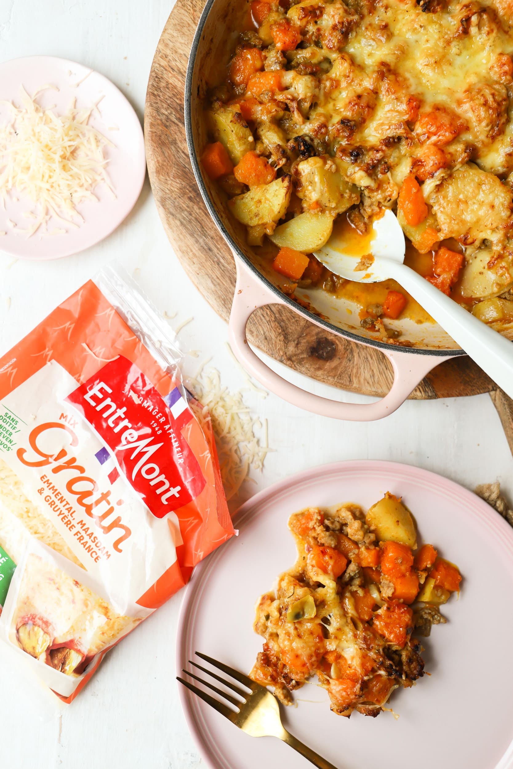 Gratin au butternut, pomme, poulet haché et croûte de fromage Entremont