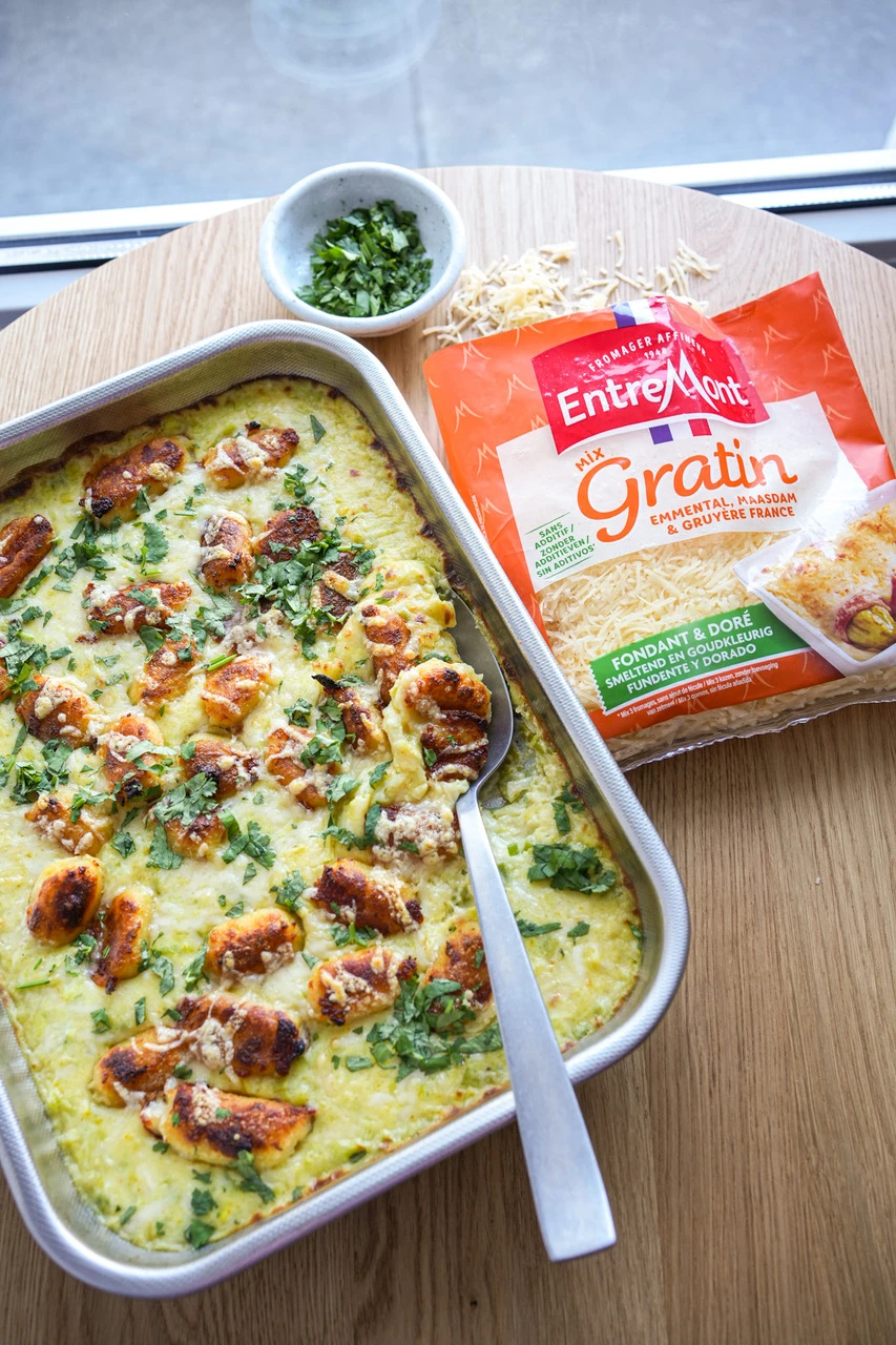 Gratin de gnocchis poêlés aux poireaux