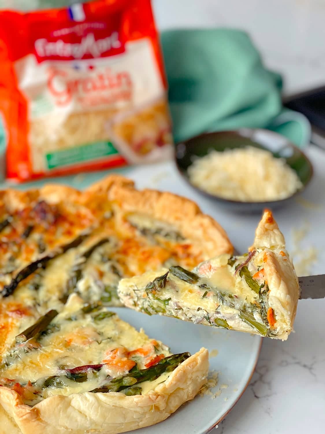 - Garnissez la quiche avec les asperges, les morceaux d’oignon et la pâte crème/saumon. Terminez la quiche avec les 50g de fromage râpé restant.
