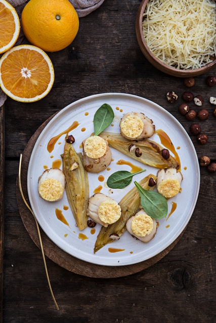 Saint jacques chips de gruyère, endives et jus d’orange
