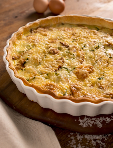 Recouvrez la pâte d’une moitié du paquet de Gruyère Râpé Entremont, ajoutez les champignons et les courgettes.